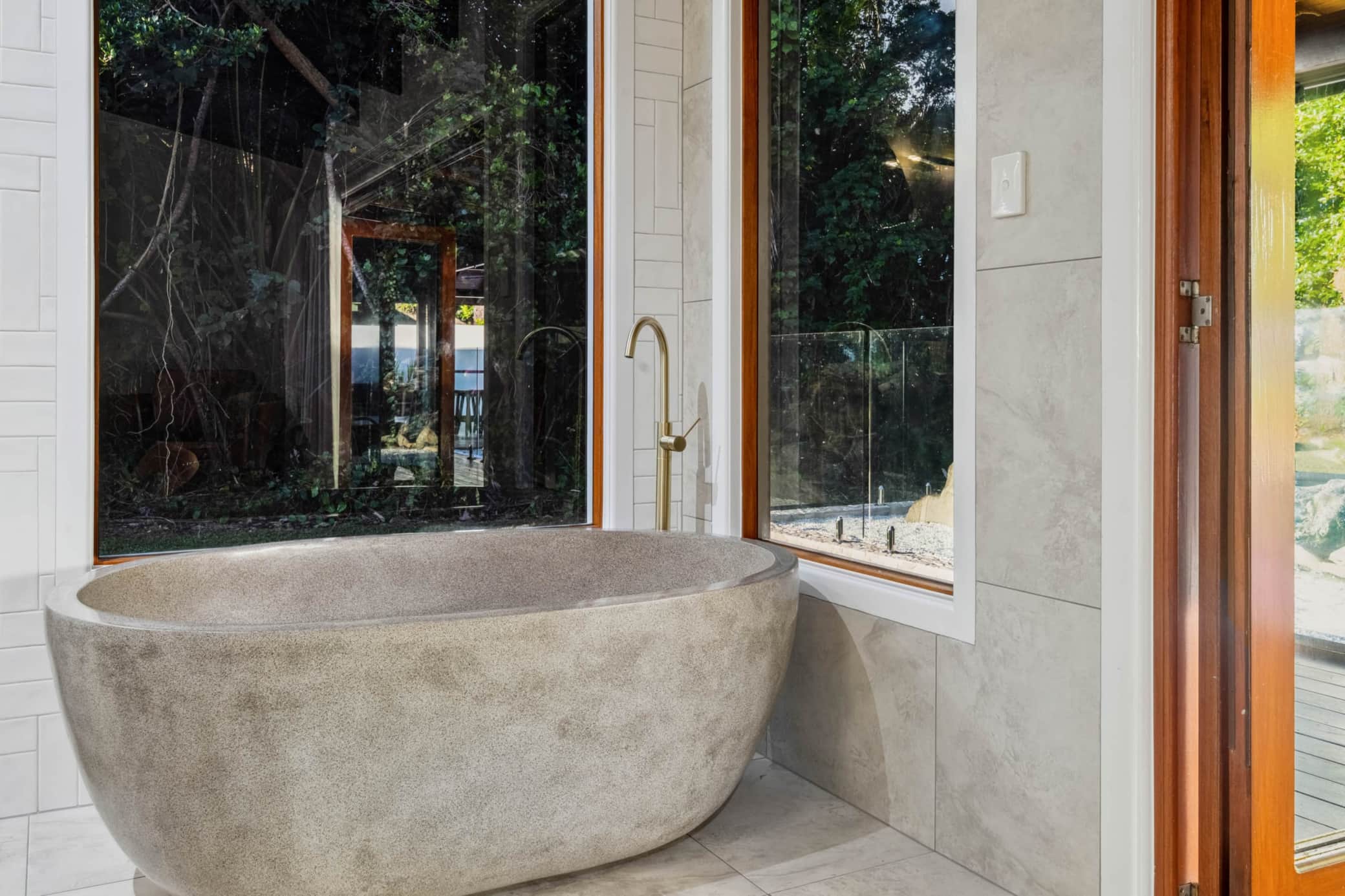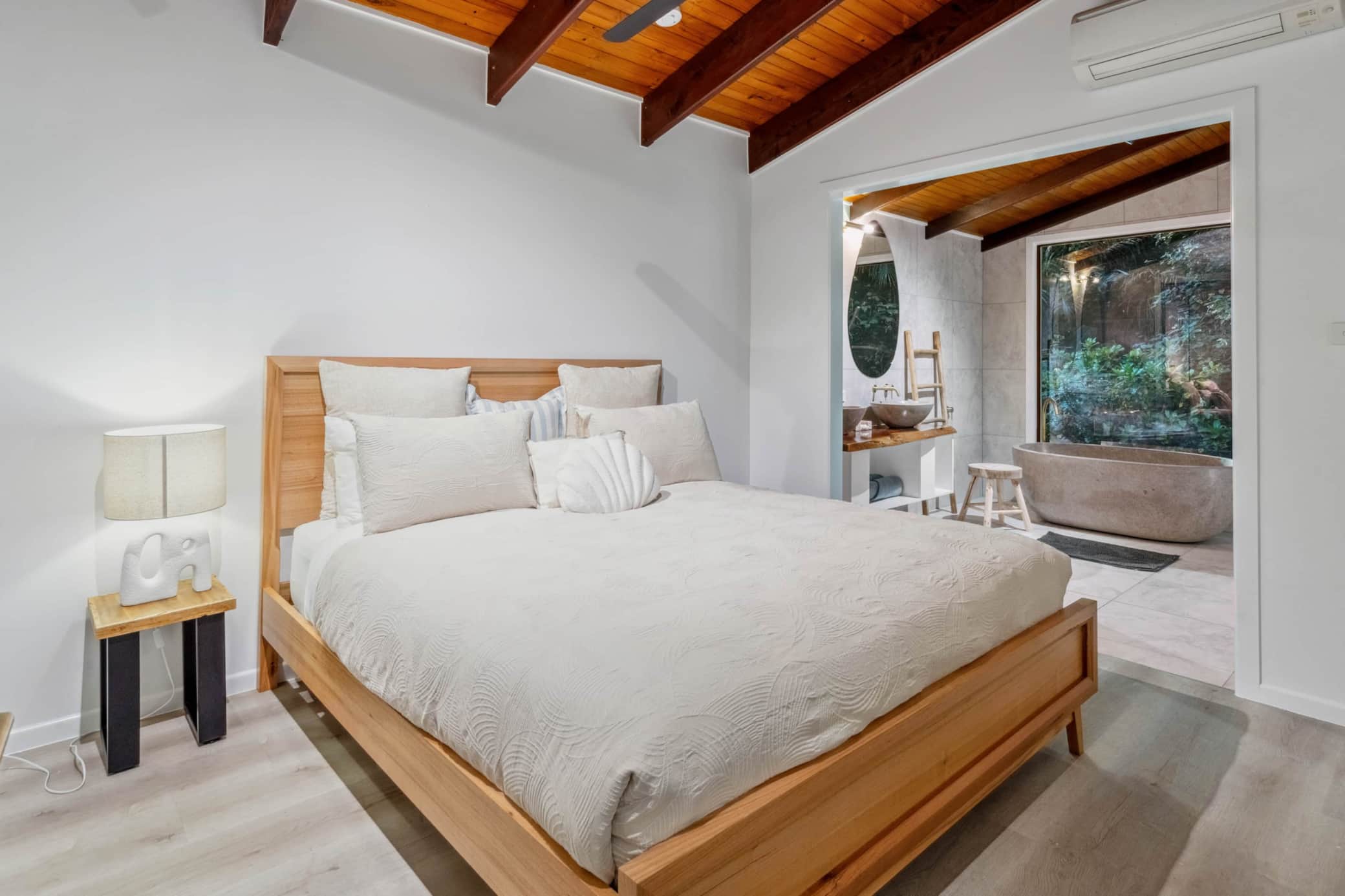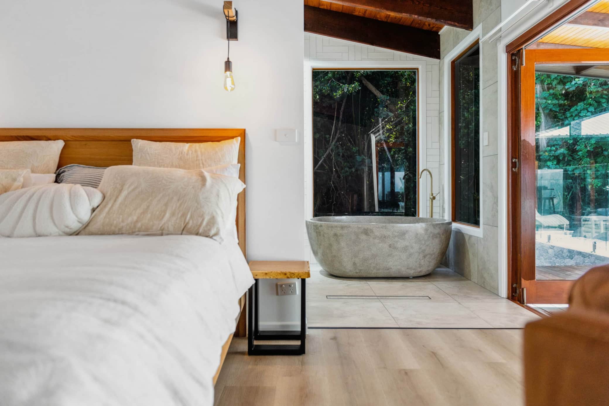 - Option 1: The main house features three spacious bedrooms. Two of the bedrooms are furnished with king-sized beds and have their own private ensuites, each offering the luxury of dual showers, stone bathtubs, and double vanities. The third bedroom can be configured with either one king bed or two king single beds, depending on your preferred sleeping arrangements. A third spacious bathroom, finished with luxurious touches, also features a stunning stone bathtub. This option will sleep 6 people maximum.