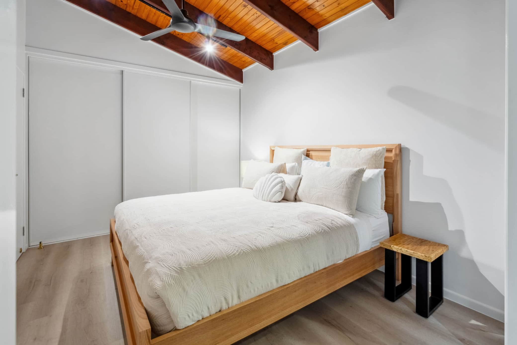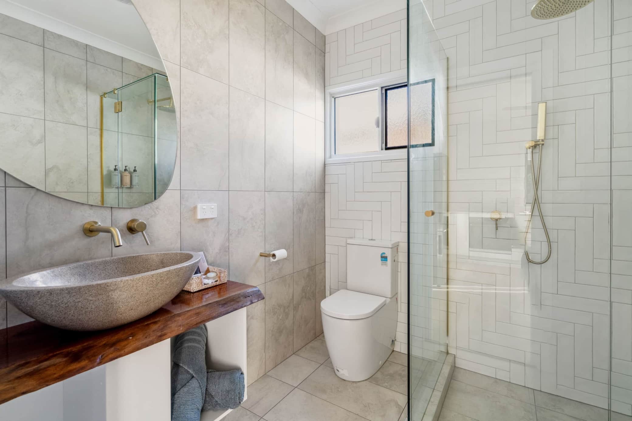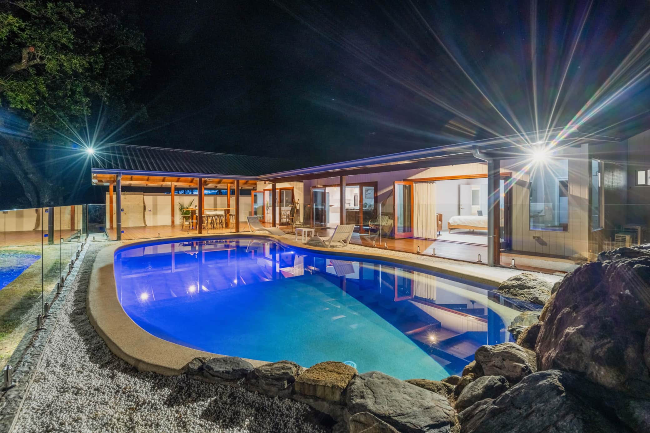 - Option 1: The main house features three spacious bedrooms. Two of the bedrooms are furnished with king-sized beds and have their own private ensuites, each offering the luxury of dual showers, stone bathtubs, and double vanities. The third bedroom can be configured with either one king bed or two king single beds, depending on your preferred sleeping arrangements. A third spacious bathroom, finished with luxurious touches, also features a stunning stone bathtub. This option will sleep 6 people maximum.